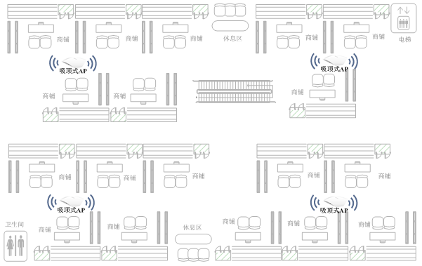 連鎖零售店面積不大,阻擋較少,一般少量AP即可達(dá)到良好的覆蓋效果,可根據(jù)規(guī)模酌情確定使用數(shù)量,布點(diǎn)點(diǎn)位均勻分布,如下圖所示: