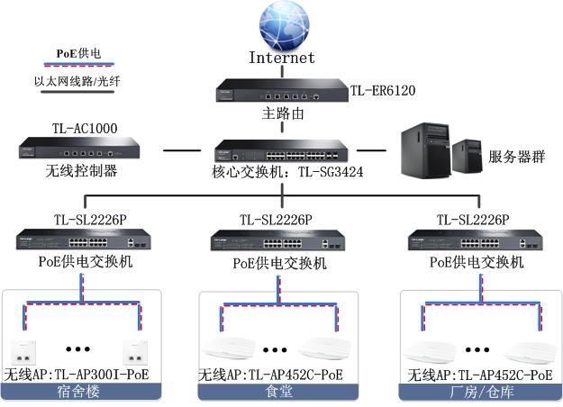 TL-AP452C-PoE支持吸頂和壁掛安裝,采用11N無線技術(shù),無線速率最大達(dá)450Mbps,非常適合食堂、廠房、倉庫等面積較大環(huán)境;TP-AP300I-PoE采用國(guó)標(biāo)86盒設(shè)計(jì),無線速率最大可達(dá)300Mbps,非常適合宿舍等房間密集型環(huán)境。兩者配合可實(shí)現(xiàn)工廠全部區(qū)域無線網(wǎng)絡(luò)覆蓋。