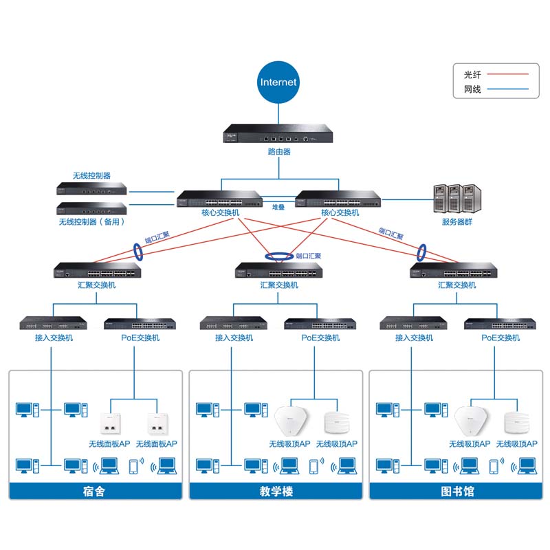 TP-LINK提供無線吸頂式、面板式、桌面式、室外等各種AP,可實(shí)現(xiàn)教學(xué)區(qū)、生活區(qū)、圖書館等所有區(qū)域的無線全覆蓋。
