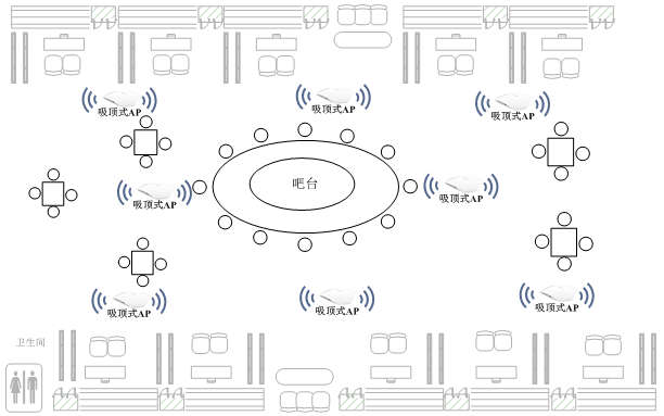 酒吧內(nèi)AP部署,采用吸頂式AP,可根據(jù)實(shí)際情況合理規(guī)劃點(diǎn)位,一般情況,吸頂式AP的覆蓋半徑為10-12米,如下圖所示:
