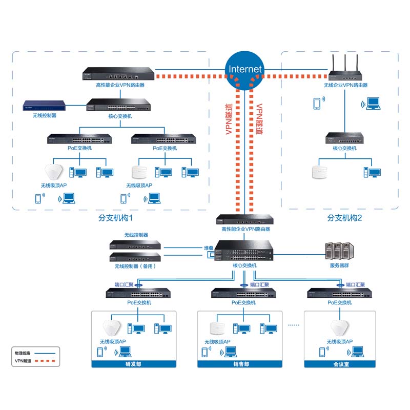 采用無線VPN路由器系列,配合無線AP,實現(xiàn)有線無線全部署。