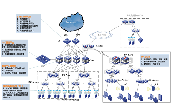 3、 辦公網(wǎng)采用高性能園區(qū)網(wǎng)交換機,配置無線控制器和Firewall等安全插卡,同時部署IRF2虛擬化技術提高可靠性,也便于網(wǎng)絡管理,部署無線方案實現(xiàn)移動辦公和終端接入。對于復雜多變的各種辦公終端,部署EAD方案實現(xiàn)安全準入。