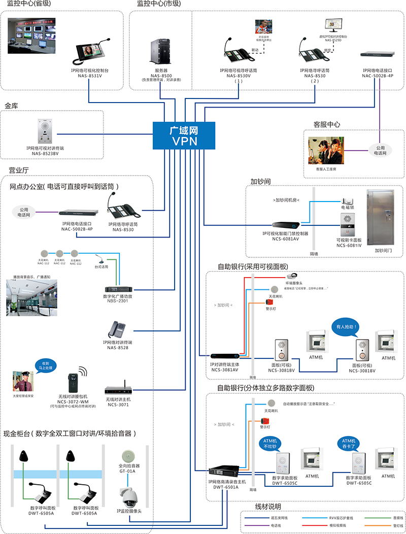 世邦銀行IP網絡對講通信系統(tǒng)采用領先的IPAudio?技術,將音頻信號以數據包形式在局域網和廣域網上進行傳送,是一套純數字傳輸的免提對講系統(tǒng)。它解決了傳統(tǒng)對講系統(tǒng)存在的傳輸距離有限、易受干擾等問題。該系統(tǒng)結構清晰,只需將終端接入計算機網絡即可構成功能強大的數字化通訊系統(tǒng),每個接入點無需單獨布線,實現計算機網絡、數字視頻監(jiān)控、內部通信的多網合一。世邦通過對銀行安防需求的深入理解,首創(chuàng)了專為自助銀行設計的分體式對講終端,以及一系列的人性化功能,使得本系統(tǒng)不局限于簡單的語音對講,而是面向銀行音頻應用的整體解決方案。