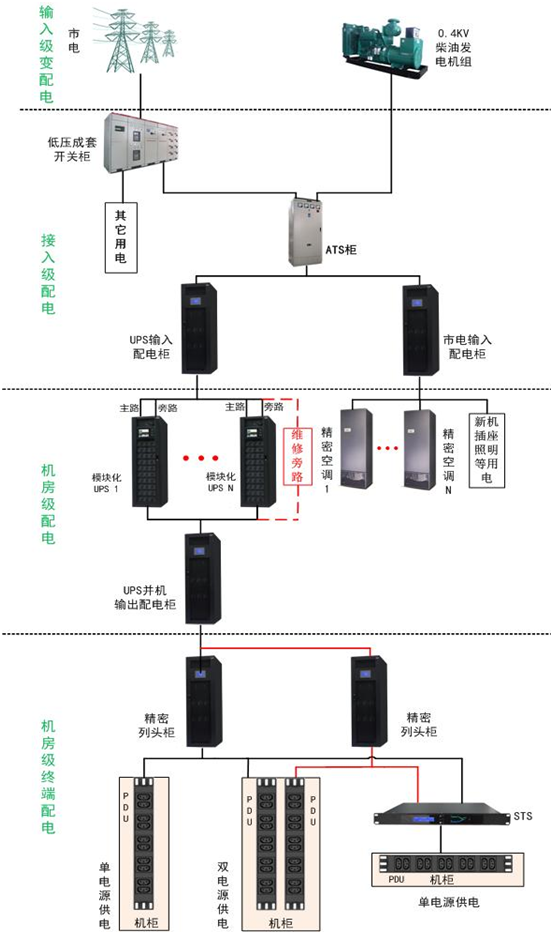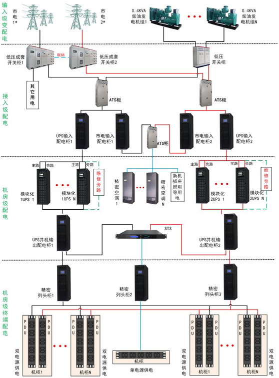 按中小數(shù)據(jù)中心業(yè)務(wù)性質(zhì)與重要性,可選用B級(冗余級)供配電系統(tǒng),滿足中小型數(shù)據(jù)中心關(guān)鍵IT設(shè)備可靠性用電要求。采用多路市電電源互為備份,并且機房設(shè)有專用柴油發(fā)電機系統(tǒng)作為備用是源系統(tǒng),市電電源間、市電電源與柴油發(fā)電機組間通過通過ATS(自動切換開關(guān))進行切換,為數(shù)據(jù)中心機房內(nèi)UPS(不間斷供電電源)、機房空調(diào)、新風、照明、維修插座等設(shè)備供電。N套獨立UPS供配電系統(tǒng),在任一套或M套(M<n)供電母線故障或維護等無法正常供電情況下,其它供電母線仍能承擔所有負載,保證機房業(yè)務(wù)供電,確保數(shù)據(jù)中心業(yè)務(wù)不受影響。在ups輸出到服務(wù)器等設(shè)備輸入間,選用精密配電列頭柜進行電源分配和供電管理,實現(xiàn)對每臺機柜用電監(jiān)控管理,提高供電系統(tǒng)的可靠性和易管理性。< p="">