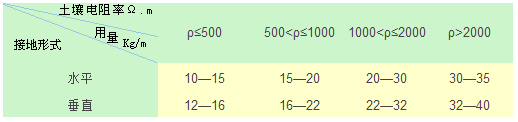 降阻劑的經(jīng)濟(jì)用量應(yīng)視不同的土壤而定,在接地體上的敷設(shè)厚度應(yīng)在5—15CM之間,為方便計(jì)算,推薦用量如下表: