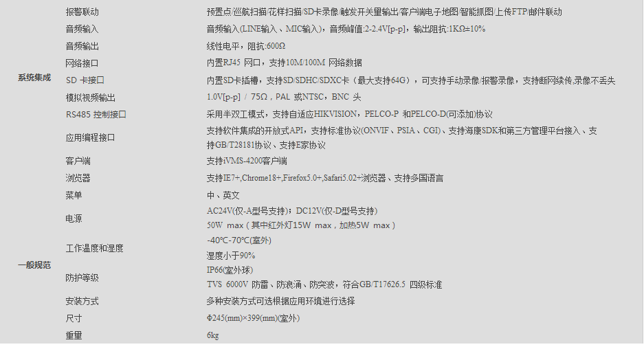 ? 支持報警功能,內(nèi)置7路報警輸入和2路報警輸出,支持報警聯(lián)動,可在報警后觸發(fā)調(diào)用預置點/巡航掃描/花樣掃描/SD卡錄像/觸發(fā)開關(guān)量輸出/客戶端電子地圖/上傳FTP/郵件聯(lián)動