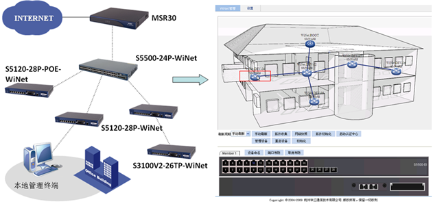 在企業(yè)或園區(qū)的網絡建設過程中,選用S5500-WiNet作千兆核心,接入層選用S5120-WiNet或S3100V2-WiNet實現(xiàn)千兆/百兆到桌面,即可享受免費的全圖形化網管,實現(xiàn)WiNet安全局域網的管理。