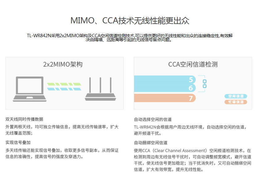 11N技術(shù) 300Mbps無線傳輸速率 TL-WR842N采用11N無線技術(shù),無線傳輸速率可達(dá)300Mbps,可滿足更多的無線客戶端接入。在客戶端數(shù)量相同時(shí)能為每個(gè)客戶端提供更高的無線帶寬,使局域網(wǎng)內(nèi)的數(shù)據(jù)
