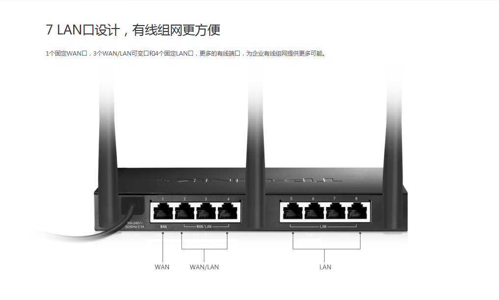 · 1個(gè)10/100M 固定WAN口,3個(gè)10/100M WAN/LAN可變接口,4個(gè)10/100M 固定LAN口
