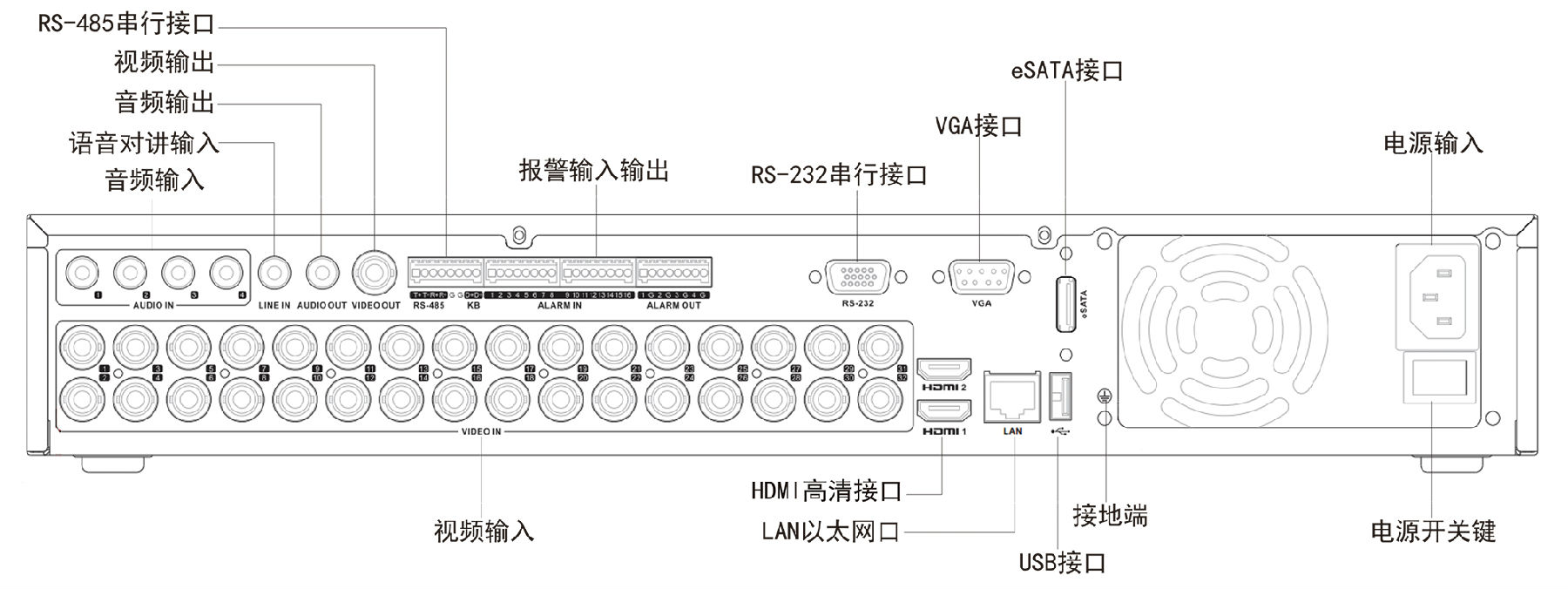 注:DS-7324HGH-SH后面板與此類似,視頻輸入通道為24路。