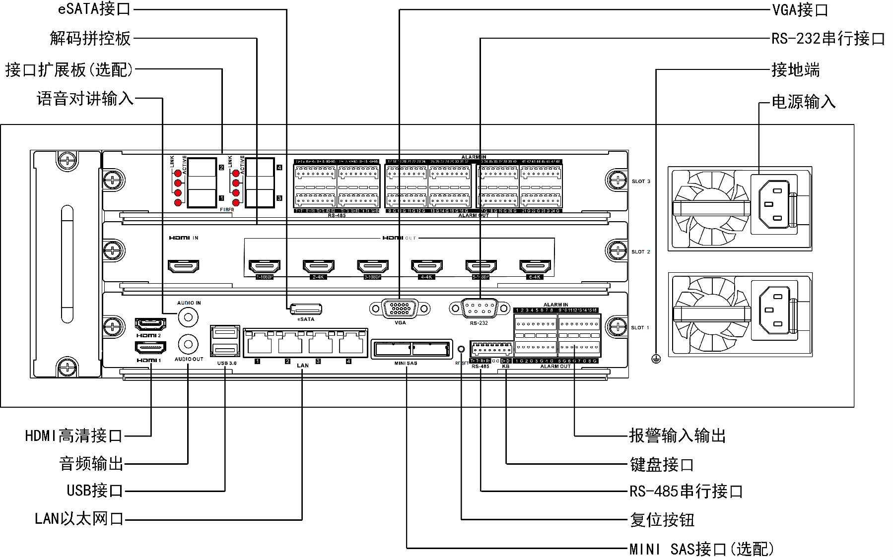 可選配接口擴展板,支持4個千兆光口,8個RS-485串行接口,32進16出報警接口。